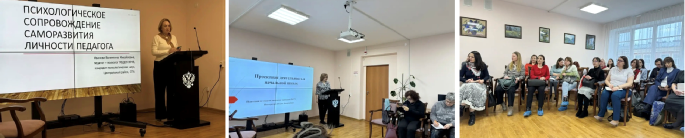 2. Иванова В.М., ГБДОУ № 83 с темой: «Психологическое сопровождение саморазвития личности педагога», включающее профилактический, просветительский, диагностический, консультационный и коррекционный этапы. Педагоги-психологи приняли активное участие в экспресс-диагностике по шкале «Доминантность», а также в психогимнастическом упражнении «33».