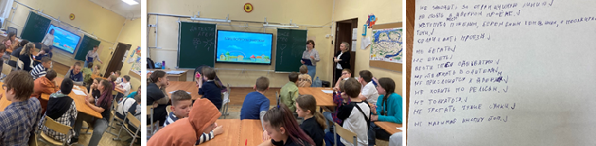 На занятиях с младшими школьниками в игровой форме совместно были выработаны правила безопасного поведения в Интернете, обучающиеся основной и средней школы дискутировали по поводу «ИнтерНЕТ или ИнтерДа», обсуждали его пользу и вред, учились, как противостоять буллингу, экстремизму, вербовкам и мошенникам в сети. Занятия способствовали повышению информационной грамотности школьников. Всего в тематических консультациях и занятиях приняло участие 1049 чел.