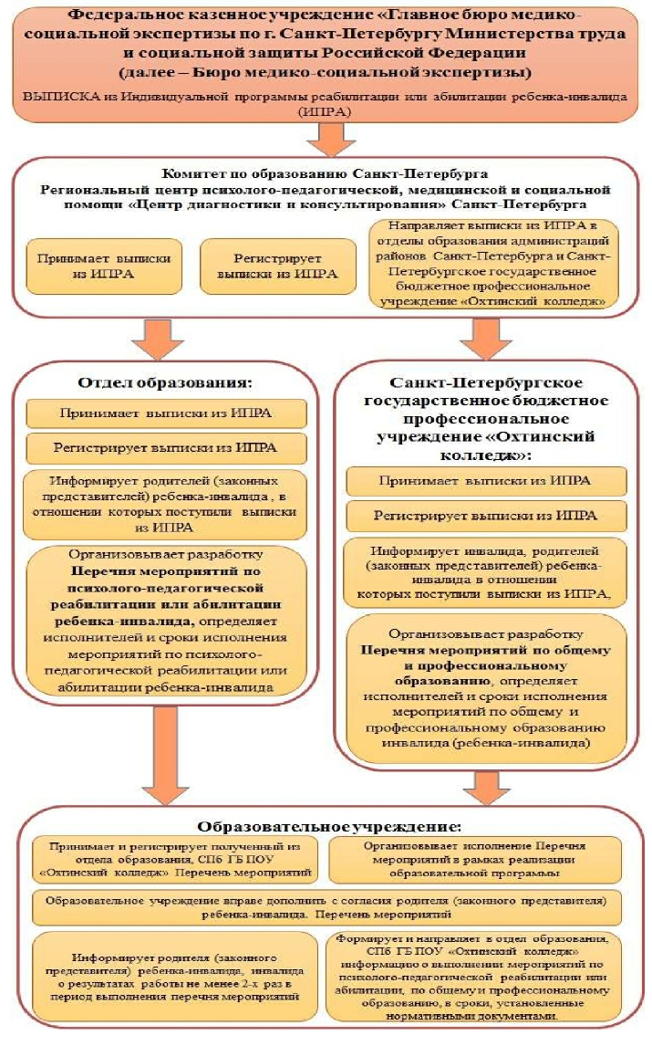 Индивидуальная программа реабилитации и абилитации ребенка-инвалида (ИПРА) К категории детей-инвалидов относятся дети до 18 лет, имеющие значительные ограничения жизнедеятельности, приводящие к социальной дезадаптации вследствие нарушений развития и роста ребенка, способностей к самообслуживанию, передвижению, ориентации, контроля за своим поведением, обучения, общения, трудовой деятельности в будущем, статус которых установлен учреждениями медико-социальной экспертизы. Индивидуальная программа реабилитации или абилитации инвалида (ребенка-инвалида) (далее - ИПРА) - комплекс оптимальных для инвалида реабилитационных мероприятий, включающий в себя отдельные виды, формы, объемы, сроки и порядок реализации медицинских, профессиональных и других реабилитационных мер, направленных на восстановление, компенсацию нарушенных функций организма, формирование, восстановление, компенсацию способностей инвалида к выполнению определенных видов деятельности. ИПРА разрабатывается федеральными государственными учреждениями медико-социальной экспертизы. ИПРА имеет для инвалида рекомендательный характер, он в праве отказаться от того или иного вида, формы, объема реабилитационных мероприятий, а также от реализации программы в целом. Бюро медико-социальной экспертизы информирует инвалида, родителей (законных представителей) ребенка-инвалида о необходимости по истечении 10 дней с момента получения ИПРА обратиться в отдел образования администрации Центрального района (по месту регистрации (фактического проживания)) для разработки мероприятий по психолого-педагогической реабилитации или абилитации. Отдел образования Центрального района информирует ППМС-центр «Развитие» Центрального района Санкт-Петербурга о поступлении ИПРА ребенка-инвалида для дальнейшей работы. Информация об организации работы по реализации мероприятий по психолого-педагогической реабилитации или абилитации, предусмотренных ИПРА в Центральном районе Санкт-Петербурга | ||||